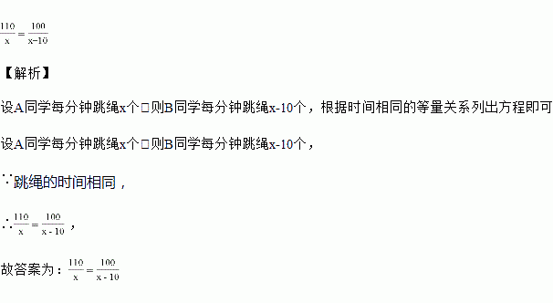 A与B两位同学进行跳绳比赛,在相同时间内,A同学跳了110个,B同学跳了100个.如果B同学比A同学每分钟少跳10个.若设A同学每分钟跳绳x个,则可列方程为_______.