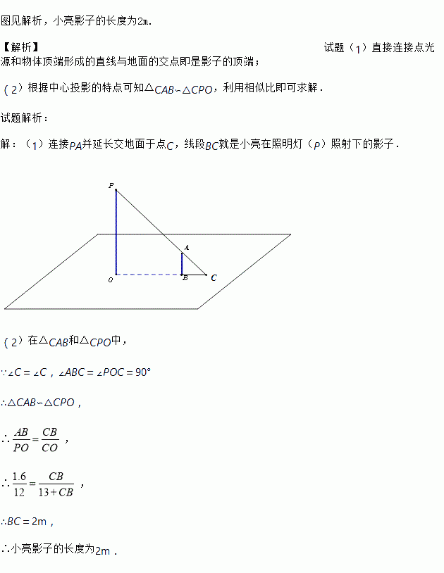 如果灯杆高PO=12m,小亮的身高AB=1.6m,小亮与灯杆的距离BO=13m,请求出小亮影子的长度.