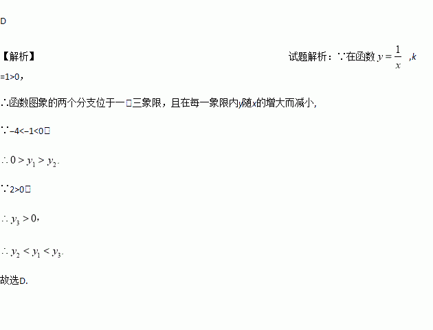 的图象上有三点(﹣4,y1),(﹣1,y2),(2,y3),则函数值y1,y2,y3的大小关系是( )