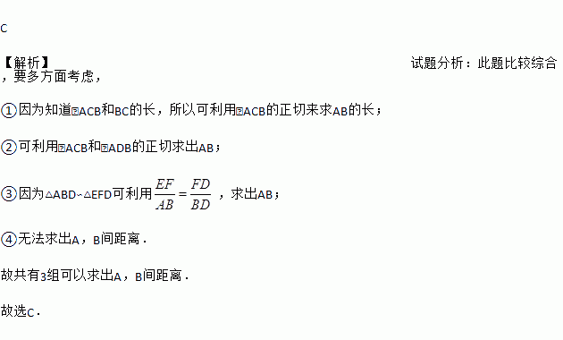 为了测量被池塘隔开的A,B两点之间的距离,根据实际情况,作出如图所示的图形,其中AB⊥BE,EF⊥BE,AF交BE于点D,C在BD上.有四位同学分别测量出以下4组数据:①BC,∠ACB;②CD,∠ACB,∠ADB;③EF,DE,BD;④DE,DC,BC.能根据所测数据,求出A,B两点之间距离的有( )