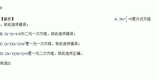 =0 B. 2x﹣3y+1=0 C. (x﹣3)(x﹣2)=x2 D. (3x﹣1)(3x+1)=3