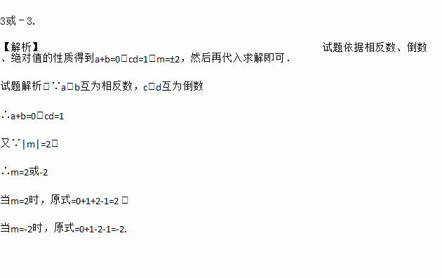 小明参加“趣味数学”选修课,课上老师给了一个问题,小明看了很为难,你能帮他一下吗?已知a,b互为相反数,c,d互为倒数,|m|=3,则+1+m﹣cd的值为多少?