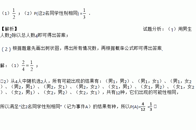 (1);(2)P(这2名同学性别相同) =. 【解析】试题分析:(1)用男生人数2除以总人数4即可得出答案; (2)根据题意先画出树状图,得出所有情况数,再根据概率公式即可得出答案. 【解析】 (1); (2)从4人中随机选2人,所有可能出现的结果有:(男1,男2)、(男1,女1)、(男1,女2)、(男2,男1)、(男2,女1)、(男2,女2)、(女1,男1)、(女1,男...