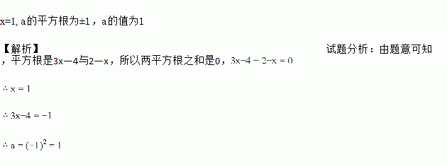 一个正数a的平方根是3x―4与2―x,则a是多少?