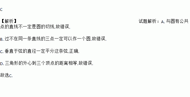C 【解析】试题解析:A. 与圆有公共点的直线不一定是圆的切线.故错误. B. 过不在同一条直线的三点一定可以作一个圆.故错误. C. 垂直于弦的直径一定平分这条弦.正确. D. 三角形的外心到三个顶点的距离相等.故错误. 故选C.