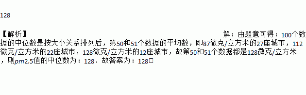 如图是我校某班同学随机抽取的我国100座城市2017年某天当地PM 2.5值的情况的条形统计图,那么本次调查中,PM2.5值的中位数为________微克/立方米.