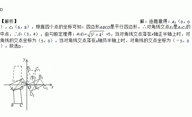 D 【解析】【解析】 由题意得:A1(0,0),C1(6,8),根据四个点的坐标可知:四边形ABCD是平行四边形,∴对角线交点E1是A1C1的中点,∴E1(3,4),由勾股定理得:A1E1==5,当对角线交点落在x轴正半轴上时,对角线的交点坐标为(5,0),当对角线交点落在x轴负半轴上时,对角线的交点坐标为(﹣5,0),故选D.