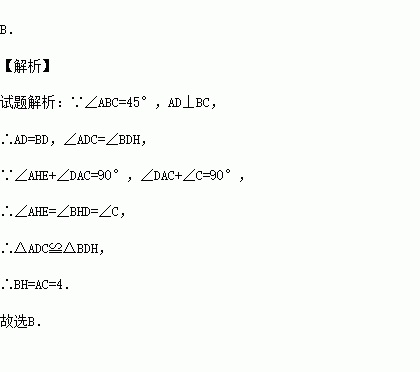 如图,已知△ABC中,∠ABC=45°,AC=4,H是高AD和BE的交点,则线段BH的长度为( )
