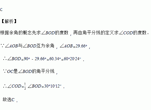 如图,已知∠AOB与∠BOD互为余角,射线OC是∠BOD的平分线,∠AOB=29.66°,则∠COD的度数是( )