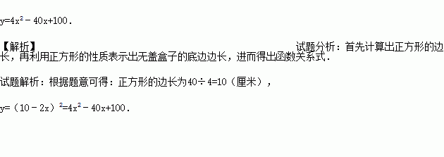 有一个周长为40厘米的正方形,从四个角各剪去一个正方形,做成一个无盖盒子.设这个盒子的底面积为y,剪去的正方形的边长为x,求有关y的二次函数.