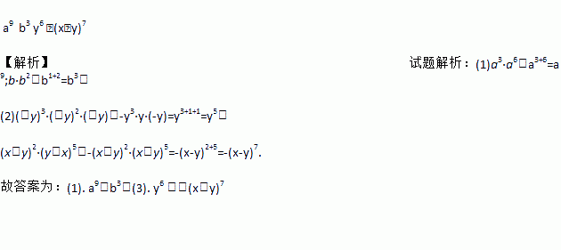 a9 b3 y6 -(x-y)7 【解析】试题解析:(1)a3·a6=a3+6=a9;b·b2=b1+2=b3; (2)(-y)3·(-y)2·(-y)=-y3·y·(-y)=y3+1+1=y5, (x-y)2·(y-x)5=-(x-y)2·(x-y)5=-(x-y)2+5=-(x-y)7. 故答案为:(1). a9,b3;(3). y6 ;-(x-y)7