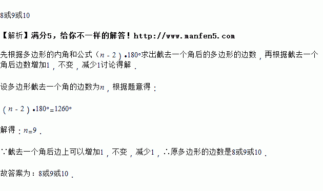 一个多边形截去一个角后,形成的另一个多边形的内角和是1260°,则原多边形的边数是为_______________.