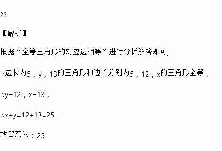 一个三角形的三边长为5,y,13,若另一个和它全等的三角形三边长为5,12,x,则x+y=______.