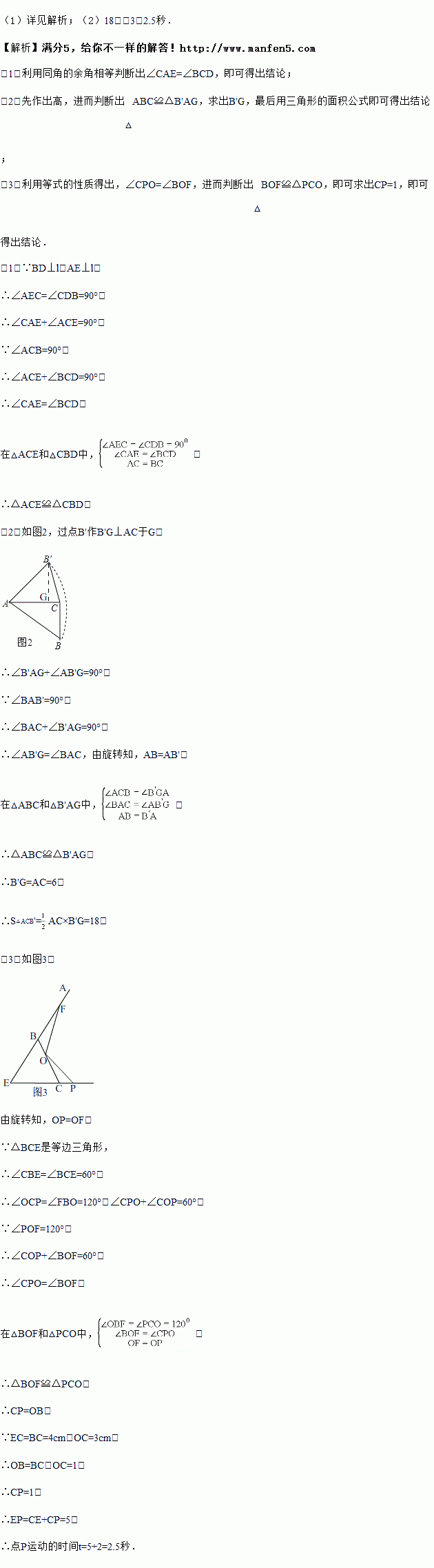 (3)拓展提升:如图3,等边△EBC中,EC=BC=4cm,点O在BC上,且OC=3cm,动点P从点E沿射线EC以2cm/s速度运动,连结OP,将线段OP绕点O逆时针旋转120°得到线段OF.要使点F恰好落在射线EB上,求点P运动的时间ts.