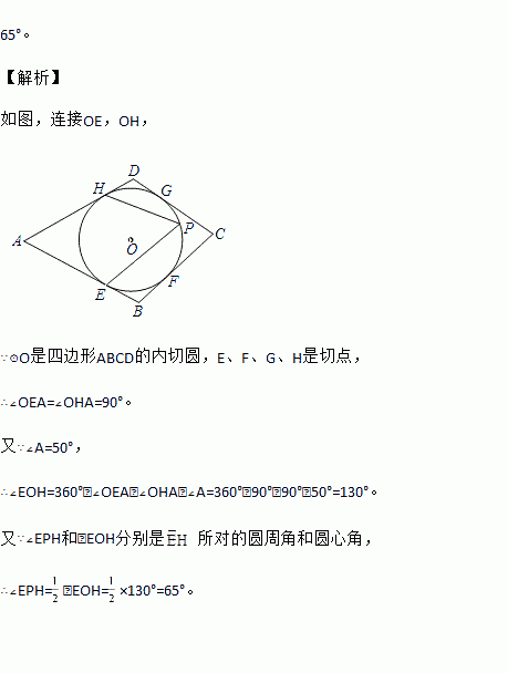如图,⊙O是四边形ABCD的内切圆,E、F、G、H是切点,点P是优弧上异于E、H的点.若∠A=50°,则∠EPH= .