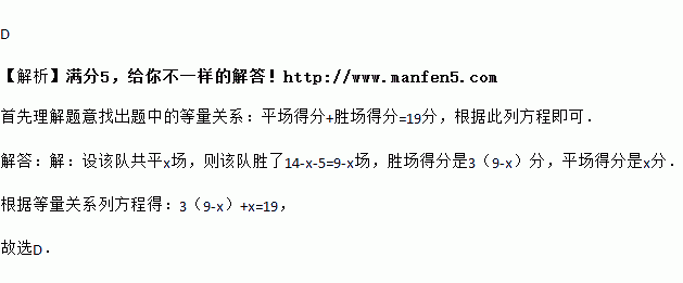 足球比赛的计分方法为:胜一场得3分,平一场得1分,负一场得0分,一个队共打了14场比赛,负了5场,得19分,设该队共平x场,则得方程( )