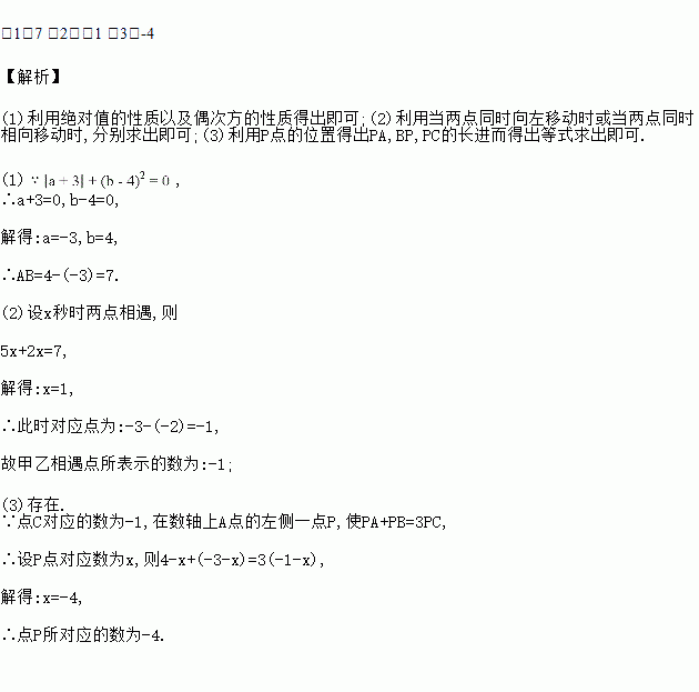 (2)若甲、乙分别从A、B两点同时在数轴上相向运动,甲的速度是2个单位/秒,乙的速度比甲的速度快3个单位/秒,求甲乙相遇点所表示的数;