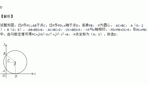 如图,在平面直角坐标系中,⊙P与x轴相切,与y轴相交于A(0,2),B(0,8),则圆心P的坐标是( )