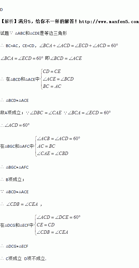 A. △ACE≌△BCD B. △BGC≌△AFC C. △DCG≌△ECF D. △ADB≌△CEA