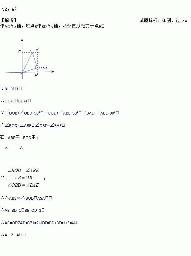 如图所示,在平面坐标系中B(3,1),AB=OB,∠ABO=90°,则点A的坐标是_____.