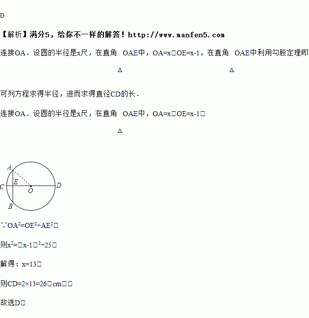 “圆材埋壁”是我国著名的数学著作《九章算术》中的一个问题,“今有圆材,埋于壁中,不知大小,以锯锯之,深一寸,锯道长一尺,问径几何?” 用现代的数学语言表达是:“如图,CD是⊙O的直径,弦AB⊥CD,垂足为E,CE = 1寸,AB = 1尺,求直径的长”. 依题意,CD长为( )