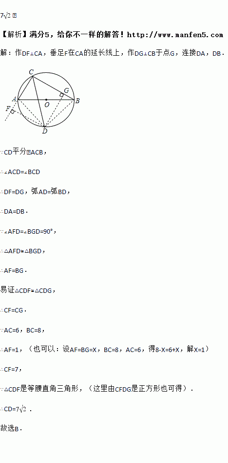 如图,⊙O的直径AB长为10,弦AC的长为6,∠ACB的角平分线交⊙O于D,则CD长为_____.