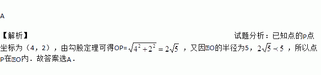 ⊙O的半径为5,圆心O的坐标为(0,0),点P的坐标为(4,2),则点P与⊙O的位置关系是 ( )