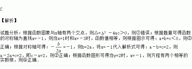 (﹣2,0)之间,其部分图象如下图,则以下结论:①b2﹣4ac<0;②a+b+c<0;③c﹣a=2;④方程ax2+bx+c﹣2=0有两个相等的实数根.其中正确结论的个数为( )