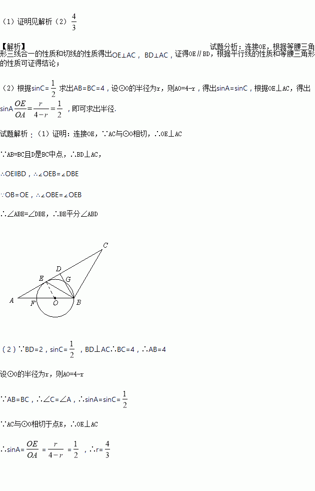 已知:如图,在△ABC中,AB=BC,D是AC中点,点O是AB上一点,⊙O过点B且与AC相切于点E,交BD于点G,交AB于点F.