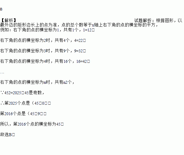 如图,在平面直角坐标系中,有若干个横坐标分别为整数的点,其顺序按图中(1,0)→(2,0)→(2,1)→(1,1)→(1,2)→(2,2)…根据这个规律,则第2016个点的横坐标为( )
