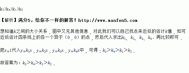 在同一坐标系中,如图所示,一次函数y=k1x,y=k2x,y=k3x,y=k4x的图象分别为l1,l2,l3,l4,则k1,k2,k3,k4从大到小排列,并用>连接的式子是_______________.