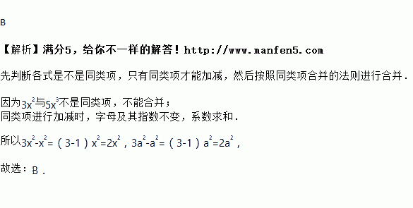 A. 3x2﹣x2=3 B. 3a2﹣a2=2a2 C. 3a2﹣a2=a D. 3x2+5x3=8x5