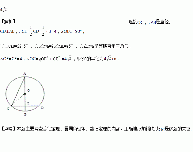 如图AB是的直径,弦CD⊥AB于E.若=22.5°,CD=8cm,则的半径为____________cm.