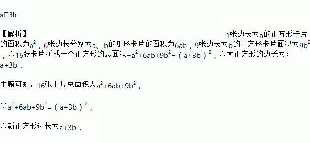 如图,有三种卡片,其中边长为a的正方形卡片1张,边长分别为a、b的矩形卡片6张,边长为b的正方形卡片9张.用这16张卡片拼成一个正方形,则这个正方形的边长为______.