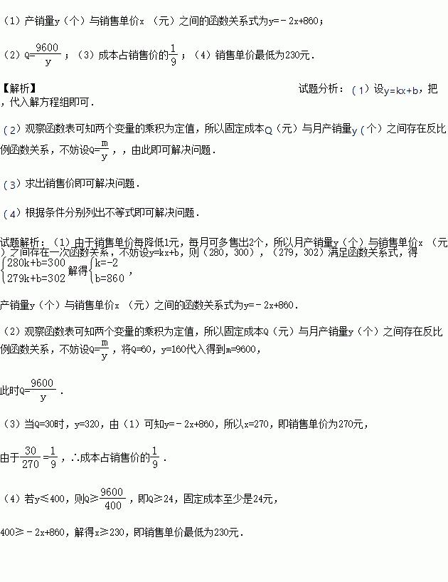 (2)求每个玩具的固定成本Q(元)与月产销量y(个)之间的函数关系式;
