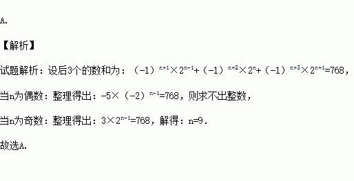按照一定规律排列的个数:-2,4,-8,16,-32,64,….若最后三个数的和为768,则为( )