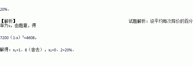 某种型号的电脑,原售价为7200元/台,经连续两次降价后,现售价为4608元/台,则平均每次降价的百分率为________.