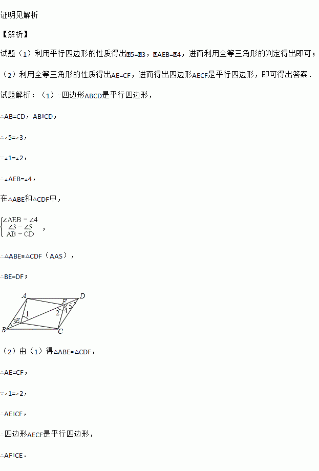 如图,四边形ABCD是平行四边形,E,F是对角线BD上的点,∠1=∠2.