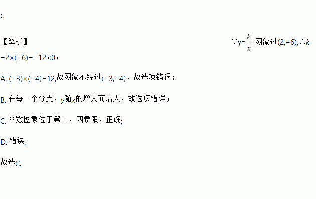 C 【解析】∵y=图象过(2,?6),∴k=2×(?6)=?12<0, A.(?3)×(?4)=12,故图象不经过(?3,?4),故选项错误; B. 在每一个分支,y随x的增大而增大,故选项错误; C. 函数图象位于第二,四象限,正确; D. 错误. 故选C.