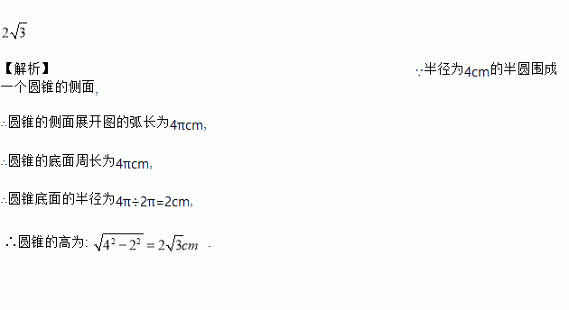 如图所示,把半径为4 cm的半圆围成一个圆锥的侧面,使半圆圆心为圆锥的顶点,那么这个圆锥的高是_______cm.(结果保留根号)