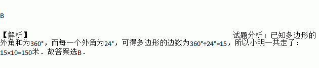 B 【解析】试题分析:已知多边形的外角和为360°,而每一个外角为24°,可得多边形的边数为360°÷24°=15,所以小明一共走了:15×10=150米.故答案选B.