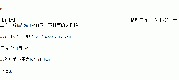 B 【解析】试题解析:∵关于x的一元二次方程kx2-2x-1=0有两个不相等的实数根, ∴k≠0且△>0,即(-2)2-4×k×(-1)>0, 解得k>-1且k≠0. ∴k的取值范围为k>-1且k≠0. 故选B.