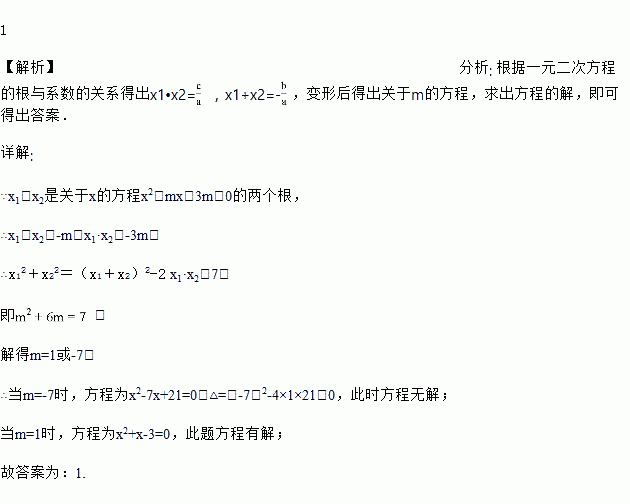 若x1,x2是关于x的方程x2+mx-3m=0的两个根,且x12+x22=7,那么m的值是____.