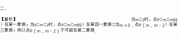 二. 【解析】当m>2时,点P(m,m﹣2)在第一象限;当0<m<2时,点P(m,m﹣2)在第四一象限;当m<0,点P(m,m﹣2)在第三象限;所以点P(m,m﹣2)不可能在第二象限.
