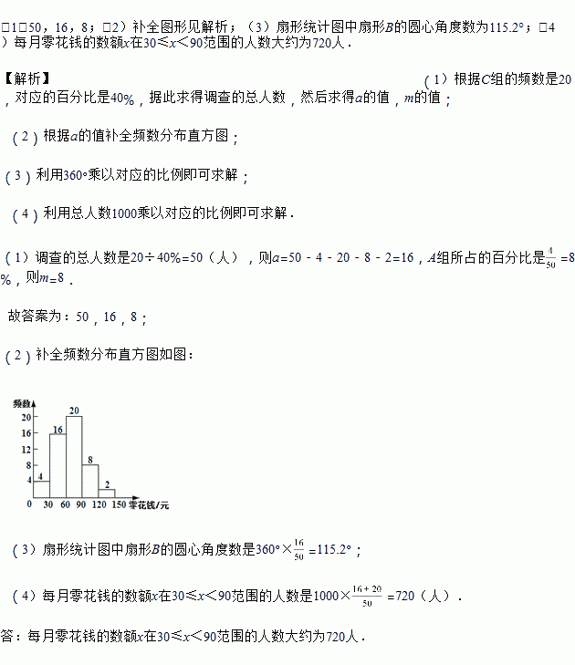 (4)该校共有人,请估计每月零花钱的数额![]()