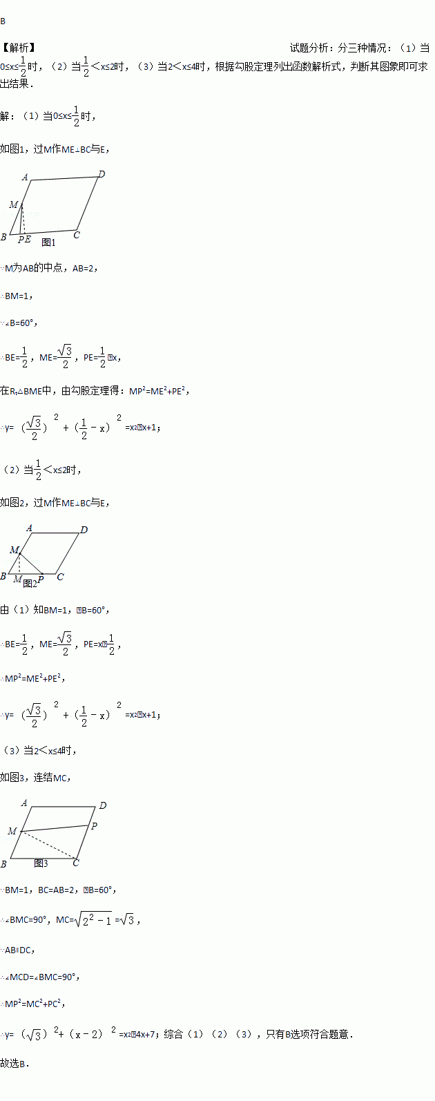 如图,菱形ABCD中,AB=2,∠B=60°,M为AB的中点.动点P在菱形的边上从点B出发,沿B→C→D的方向运动,到达点D时停止.连接MP,设点P运动的路程为x,MP 2=y,则表示y与x的函数关系的图象大致为( )