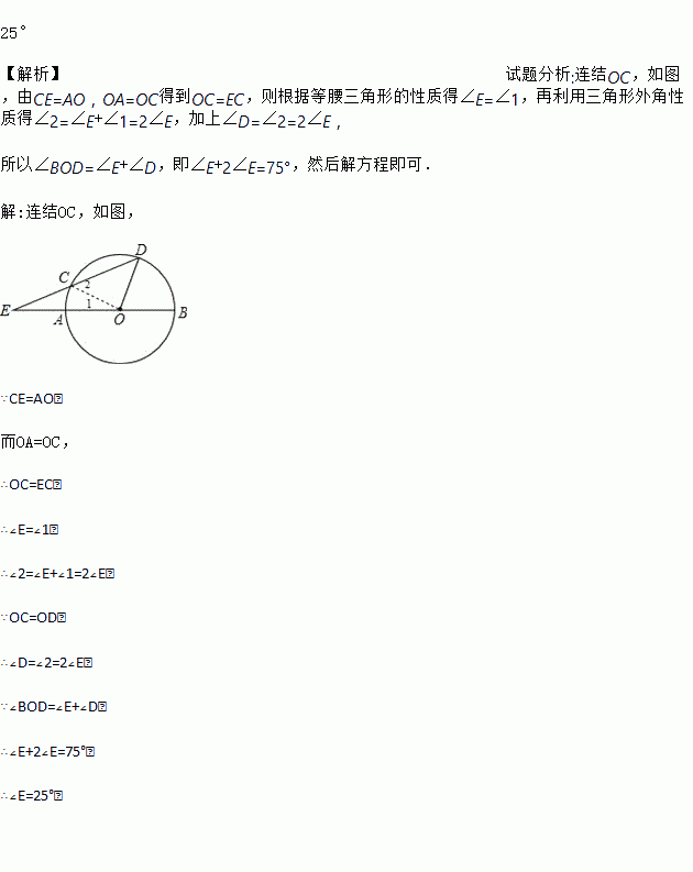如图,AB是半圆O的直径,D是半圆上的一点,∠DOB=75°,DC交BA的延长线于E,交半圆于C,且CE=AO,求∠E的度数.