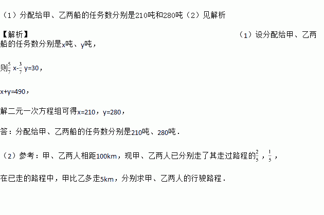 (1)将一批重490吨的货物分配给甲、乙两船运输.现甲、乙两船已分别运走其任务数的