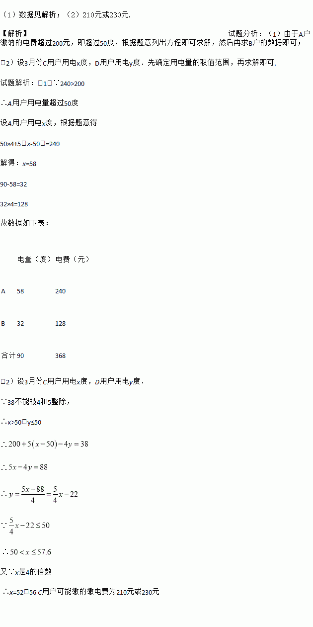 (1)数据见解析;(2)210元或230元. 【解析】试题分析:(1)由于A户缴纳的电费超过200元,即超过50度,根据题意列出方程即可求解,然后再求B户的数据即可; (2)设3月份C用户用电x度,D用户用电y度.先确定用电量的取值范围,再求解即可. 试题解析:(1)∵240>200 ∴A用户用电量超过50度 设A用户用电x度,根据题意得 50×4+5(x-50...