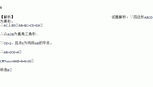 如图,在菱形ABCD中,对角线AC、BD相交于点O,E为AB的中点,且OE=2,则菱形ABCD的周长为( )
